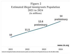 – Le Centre d'études sur l'immigration estime provisoirement que la population d'immigrants illégaux est passée à 14 millions en 2024, soit 3,8 millions de plus qu'en janvier 2021, lorsque le président a pris ses fonctions. Cependant, les données du Bureau du recensement sur lesquelles ces données sont fondées ne reflètent peut-être pas entièrement l'afflux récent ce qui augmente le sous-dénombrement des immigrants illégaux.