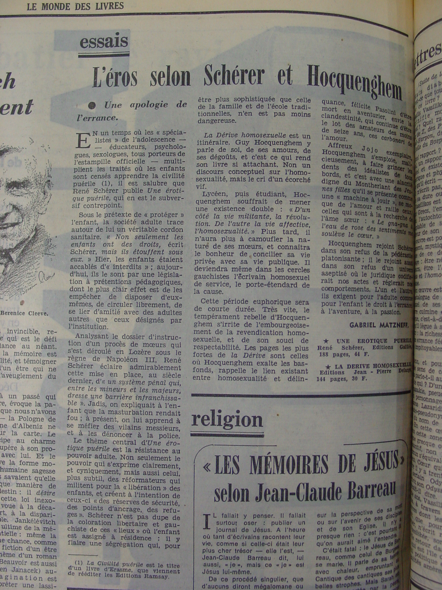 Deux ans plus tard, en 1978, le même récidive dans le compte rendu fait par ‘Le Monde des livres’ du dernier ouvrage de René Schérer et Guy Hocquenghem et semble mal supporter, c’est le moins qu’on puisse dire, une certaine difficulté d’accès à la chair fraîche imposée par les lois bourgeoises, pour ne pas dire carrément fascistes: «sous le prétexte de «protéger» l’enfant, la société adulte trace autour de lui un véritable cordon sanitaire. […] Jadis on expliquait à l’enfant que la masturbation rendait fou; à présent on lui apprend à se méfier des vilains messieurs et à les dénoncer à la police […] Non seulement les enfants ont des droits, écrit Schérer, mais ils étouffent sous eux». Hier, les enfants étaient accablées d’«interdits»; aujourd’hui, ils le sont par une législation à prétention pédagogiques, dont le plus clair effet est de les empêcher de disposer d’eux-mêmes, de circuler librement, de se lier d’amitié avec des adultes autres que ceux désignés par l’institution» (Le Monde, 17 février 1978).