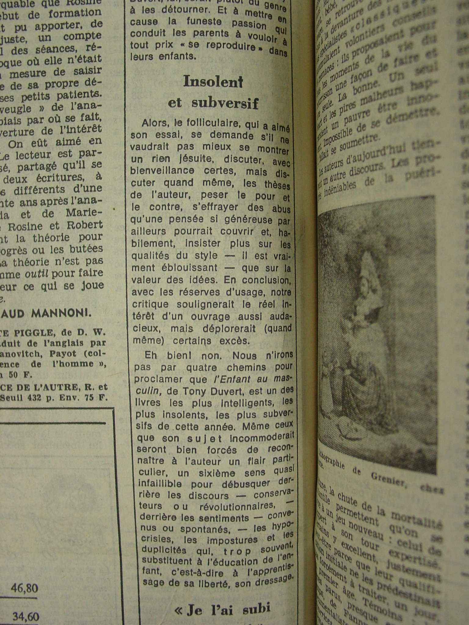 En 1980, Roland Jaccard encore salue, dans ‘Le Monde des livres’, la dernière publication de Tony Duvert, L’enfant au masculin, avec ces mots: ce livre «traite d’un sujet qui chagrine les familles, indigne les vertueux, dérange les plus permissifs et choque même les professionnels du scandale: la pédérastie». Et Jaccard loue cette «pensée si généreuse» qui débusque les «hypocrisies» (Le Monde, 14 novembre 1980; suite 1, 2).