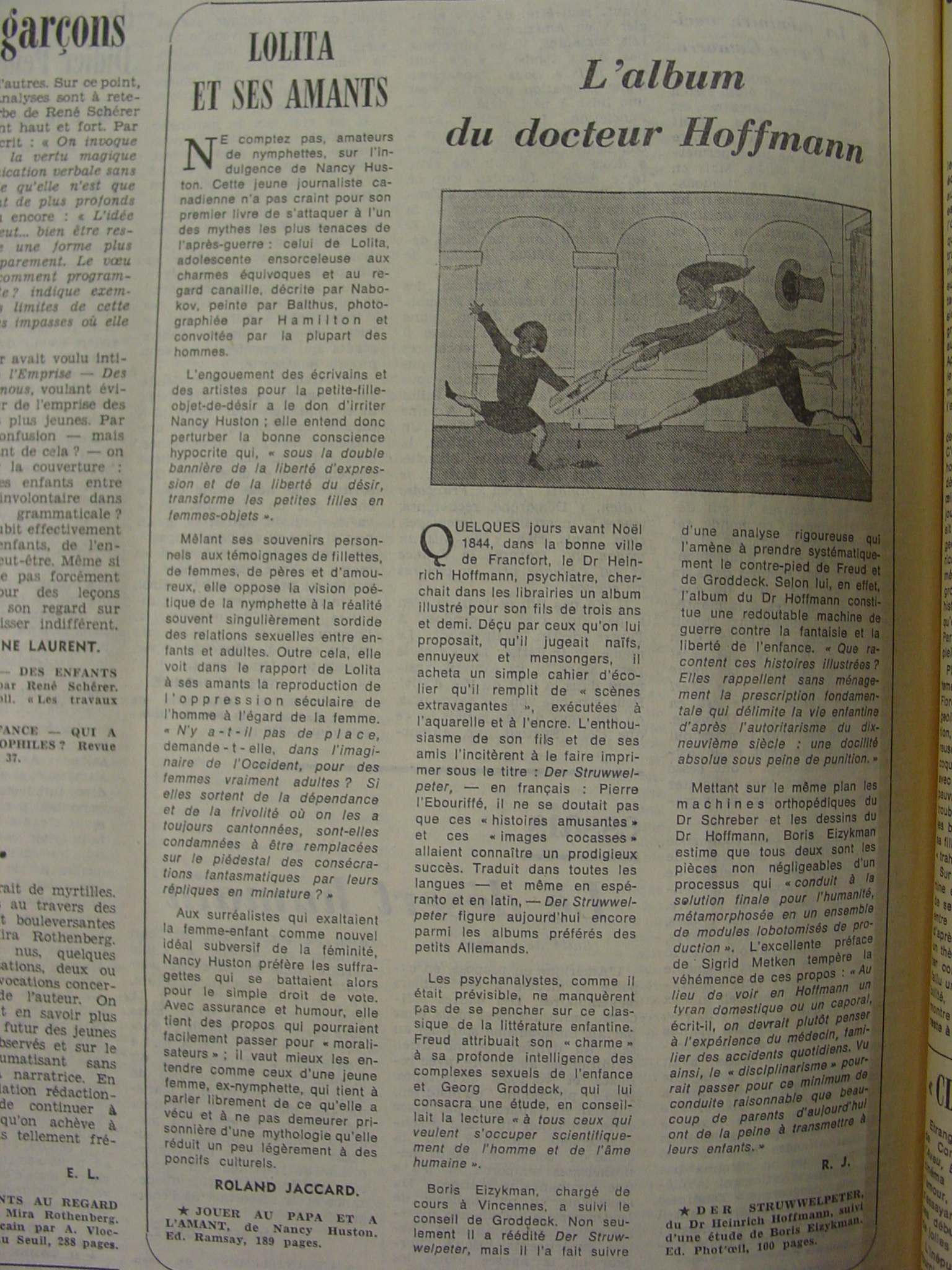 Le féminisme fournit de même une improbable base critique: Le même jour et sur la même page, Roland Jaccard présente le premier livre de Nancy Huston, «Jouer au papa et à l’amant». L’ouvrage, assez offensif, dénonce la bonne conscience hypocrite qui «sous la double bannière de la liberté d’expression et de la liberté du désir transforme les petites filles en femmes-objets» (Le Monde, 31 août 1979 p. 2).