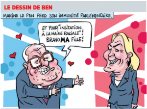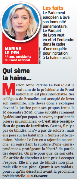 Le moindre crimepensée sera désormais durement réprimé par la police politique. Le quotidien Le Matin ne lésine pas sur la semonce, qui aligne commentaire et dessin de presse sur cette information essentielle de la levée de l'immunité parlementaire du député européen Marine Le Pen en raison de propos non conformes à l'ordre actuel.
