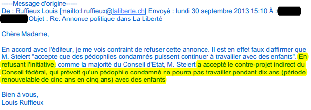 La publicité a été achetée par M. Kilchenmann à la régie publicitaire Media f., filiale du groupe Saint-Paul, le groupe qui possède La Liberté. Media f. a transmis le mail de validation à M. Kilchenmann avec copie... au rédacteur en chef de La Liberté. Grand reporter.