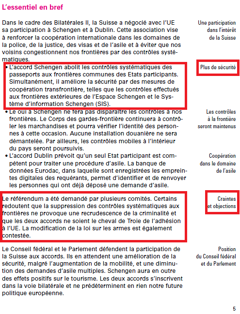 Brochure schengen"Dans ses explications relatives à la votation populaire sur les accords bilatéraux 1 avec l'UE, le Conseil fédéral s'était exprimé comme suit: "... les craintes ... de voir la Suisse être envahie par des ressortissants communautaires ne sont pas justifiées. L'expérience montre en effet que les migrations intercommunautaires demeurent limitées".