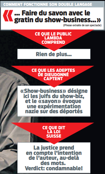 Faisant écho au JT de la RTS, qui entend juger l'"esprit" des spectacles de Dieudonné et faire oeuvre de système pour en démontrer l'inexistence, Le Matin se fend ce jour d'un monument de culture gestapiste, traquant la bête immonde dans les derniers recoins d'un humour qui n'appartiendrait plus à la gauche.