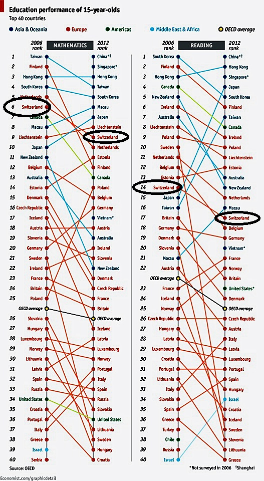 Nous n’avons pas encore les résultats cantonaux des tests PISA effectués en 2012 - dont les résultats internationaux sont tombés l’an passé - mais la comparaison faite en maths et en lecture par « The Economist » (cf. schéma) entre 2006 à 2012 laisse pantois. La Suisse a encore reculé, après avoir déjà dégringolé lors des années qui ont précédé celles-là.Conclusion : l’affaiblissement de l’assimilation par les élèves d’une culture scolaire traditionnelle ne peut s’expliquer par la seule évolution de la société.