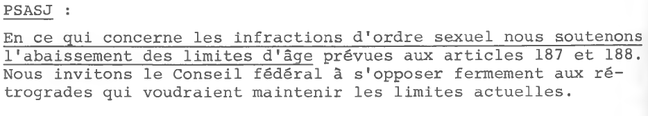 "En ce qui concerne les infractions d'ordre sexuel nous soutenons l'abaissement des limites d'âge prévues aux articles 187 et 188. Nous invitons le Conseil fédéral à s'opposer fermement aux rétrogrades qui voudraient maintenir les limites actuelles."