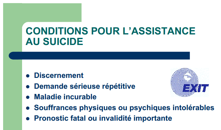 La nouvelle est tombée durant le week-end, le 24 mai dernier, le 19h30 de la RTS annonce la généralisation d'un nouveau barème de critères propres à ouvrir, auprès de l'administration d'Exit, l'assistance au suicide à des candidats ne souffrant pas de maladie incurable.