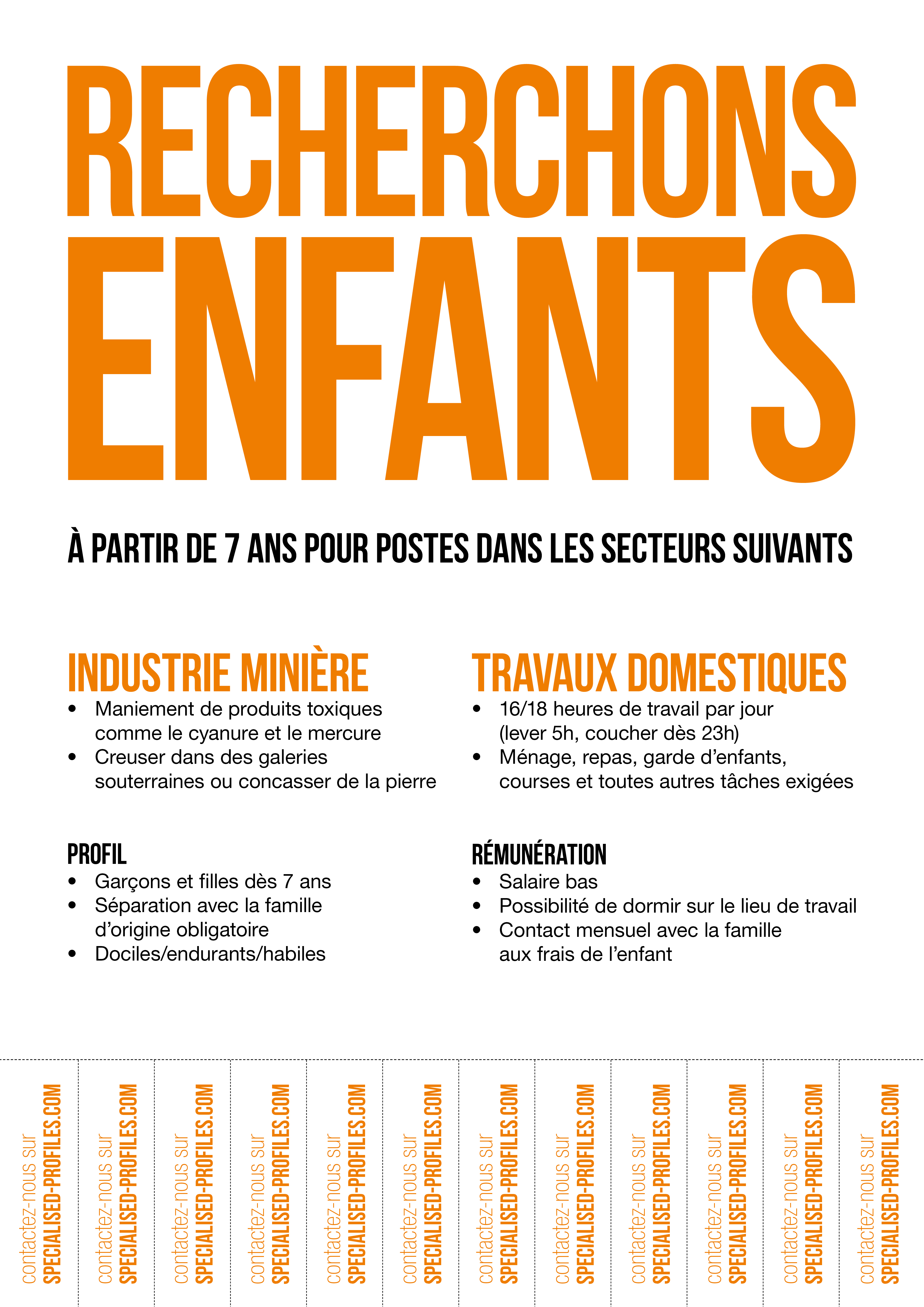 «Recherchons petites filles…» C’est ainsi que débutent les différentes annonces d’emplois plutôt dérangeantes parues hier et aujourd’hui dans la presse suisse, sur Internet ainsi que dans différents emplacements publics à travers le pays. De telles annonces n’existent pas, mais les situations qu’elles décrivent sont bien réelles. «Le sort des 5,5 millions d’enfants victimes de travail forcé à travers le monde est méconnu du grand public suisse, d’abord parce que ce fléau touche avant tout des pays éloignés mais aussi parce que ces enfants ne sont pas en position de témoigner. Et si c’était mon enfant?, est la question que nous souhaitons que les gens se posent», explique Vito Angelillo, Directeur général de Terre des hommes.