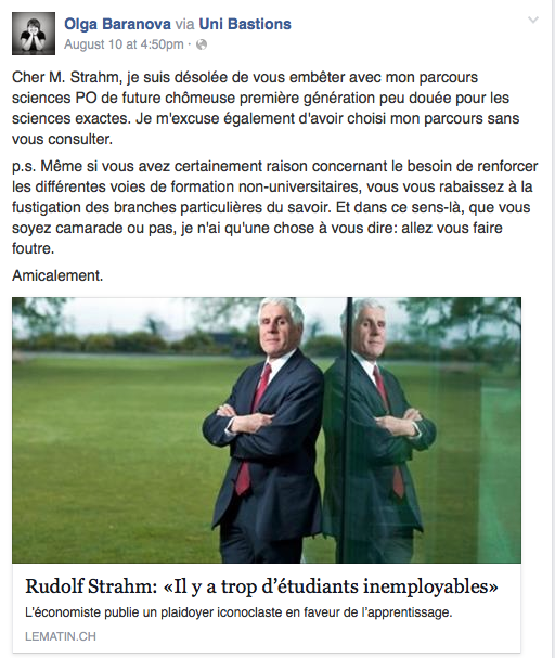 Anciennement ‘co-présidente’ de la jeunesse socialiste genevoise, conseillère municipale en Ville de Genève pour le PS, Olga Baranova se permet d’insulter le bon sens de son collègue socialiste Rudolf Strahm. En effet, une nouvelle génération de filières ayant envahi le cadre de l’université, on ne sait pas très bien quelles sont les perspectives d’avenir d’une telle politique. La grande fête estudiantine bat son plein, mais les acquis se désagrègent. Se sentant ouvertement visée, l’élève en ‘sciences PO’, filière souvent considérée par la droite radicale comme école de propagande gauchiste, décide de laisser de côté l’élégance et l’argumentation au profit d’une attaque un peu lâche et hystérique sur Facebook. Espérons que cette jeunesse rétrograde, accrochée aux prétendus acquis de 1968, avec pour seul projet politique, un contresens philosophique - “Il est interdit d’interdire!” - , soit peu représentative de la génération qui s’apprête à affronter un avenir s’annonçant plutôt sombre.