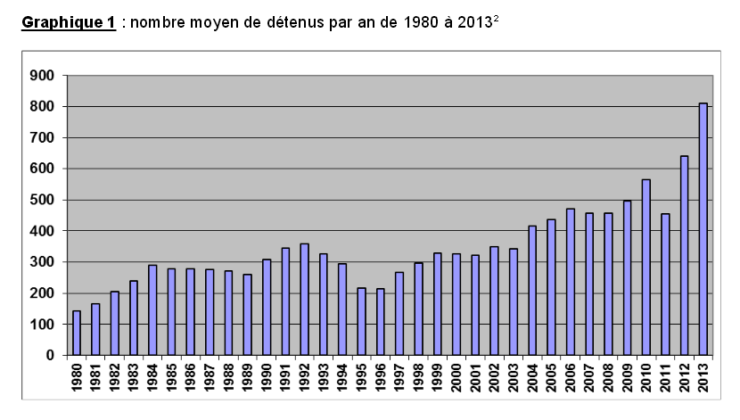 Il est intéressant, sur ce premier graphique, de noter que c’est à partir de l’année 2008 que la courbe du nombre de détenus explose dans cette prison. Il va donc être difficile de contester le lien entre immigration et délinquance.