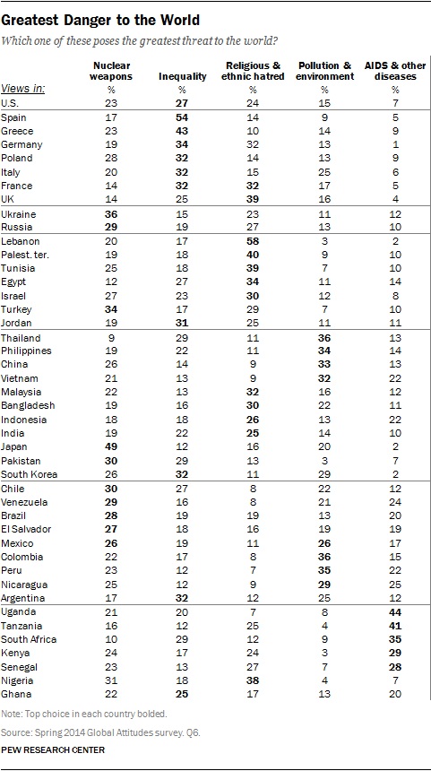 Au printemps de cette année, avant même que la plupart de ces événements marquants aient eu lieu, nous avons interrogé des personnes dans 44 pays et posé des questions sur la plus grande menace pour le monde. [...] – Pew Research (traduction)