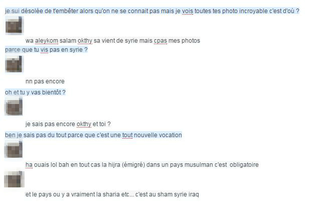 Ce sera sa quatrième tentative. Ses parents ont confisqué son passeport, mais "dès qu'[elle a] tout ce qu'il faut", Dounia* "bouge direct". Objectif : rejoindre les jihadistes de l'Etat islamique en Syrie. En attendant de pouvoir mettre son plan à exécution (piquer les papiers d'identité de sa sœur, "Inch Allah"), cette adolescente du sud-est de la France poste des photos de combattants et de combattantes de l'Etat islamique sur Facebook. C'est en nous intéressant à ces clichés que nous l'avons contactée, via le faux profil d'une Parisienne de 15 ans que nous avons créé pour comprendre le rôle des réseaux sociaux dans la radicalisation de certaines jeunes filles.