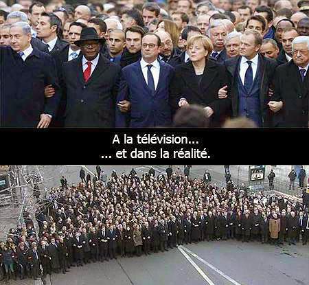 Ainsi, donc, pour que M. Hollande et M. Valls remontent dans les sondages, on mit en place un dispositif massif de récupération, faisant défiler les responsables politiques (controversés et parfois censeurs inattendus) dans une rue adjacente (http://www.canalfrance.info/Des-journalistes-allemands-On-nous-a-trompes-les-leaders-ne-marchaient-pas-a-la-tete-du-peuple-a-Paris-ils-defilaient_a3232.html), alors même que les tensions socio-religieuses restent maximales dans tout le pays. Si cela n'est pas du cynisme…