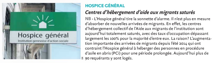 L’Hospice général tire la sonnette d’alarme. Il n'est plus en mesure d'absorber de nouvelles arrivées de migrants. En effets, les centres d'hébergement collectif de l'Aide aux migrants de l'institution sont aujourd'hui totalement saturés, avec des taux d'occupation dépassant largement les 100% pour la majorité d'entre eux. La raison? L'augmentation importante des arrivées de migrants depuis l'été 2014 qui ont contraint l'Hospice général à héberger des personnes en procédure d'asile en abris pour une période prolongée.