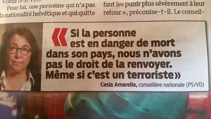 Vos propos sur les terroristes en danger de mort dans leur pays et qui doivent êtres protégés sont tout simplement scandaleux et inadmissibles de la part d’une conseillère nationale. Ce”s”la mérite un carton rouge et une expulsion du conseil national !