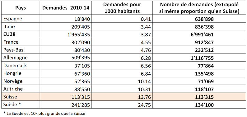 - en comparaison internationale, la Suisse doit traiter un nombre de demandes largement supérieur à la moyenne. Le fait que le nombre de demandes augmente désormais aussi dans d'autres pays, mais partant d'un niveau beaucoup plus bas, ne doit pas servir à dissimuler la charge exceptionnelle que subit la Suisse. On assiste en réalité uniquement à un certain équilibrage des effectifs sur plusieurs années;