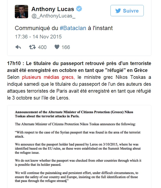 Selon plusieurs médias grecs, le ministre grec Nikos Toskas a indiqué samedi que le titulaire du passeport de l'un des auteurs des attaques terroristes de Paris avait été enregistré en tant que réfugié le 3 octobre sur l'ile de Leros.