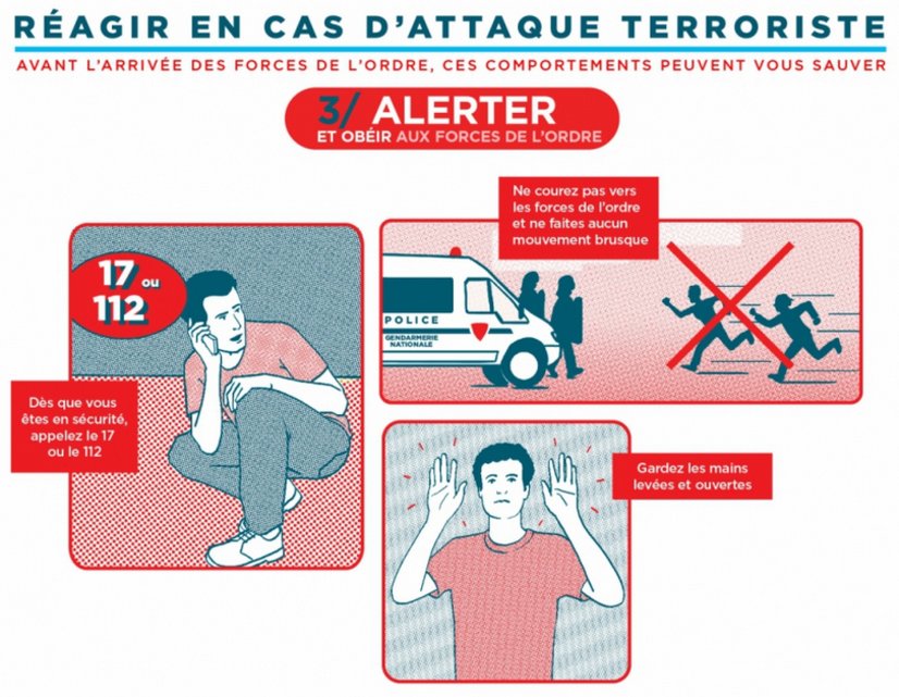 Inspirée de la signalétique des consignes de sécurité présentes à bord des avions, elle détaille trois grandes catégories de conseils en attendant l’arrivée des forces de l’ordre et des secours : s’échapper, se cacher, et alerter.