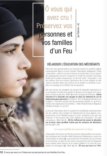En guise de solution au problème, le magazine appelle les parents musulmans à émigrer vers le « Califat qui a mis en place des écoles où les programmes sont réellement islamiques et purifiés de toutes les mécréances ».