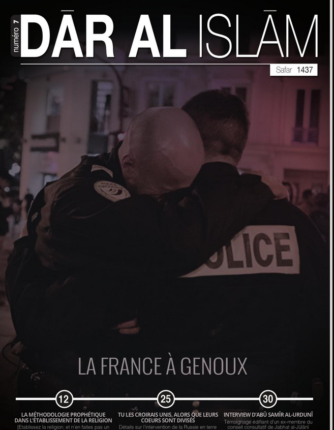 Dans son dernier numéro au titre révélateur « La France à genoux », le magazine, dont l’objectif est de réunir sous son égide les djihadistes français, se réjouit des attentats de Paris perpétrés au nom de « Daech » dans la nuit du 13 au 14 novembre.