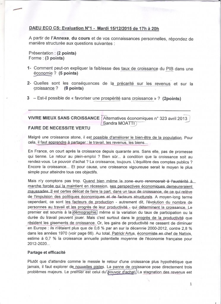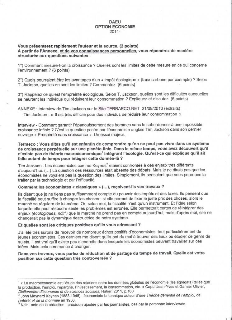 Cette fin du mois de décembre 2015, à l’Université du Mirail de Toulouse (seconde ville universitaire de France), à l’examen du DAEU (Diplôme national d'accès aux études universitaires, examen permettant aux non bacheliers d’obtenir l’équivalent du Bac) (cf copie des documents officiels) étaient présentés, en option économie, les sujets suivants :