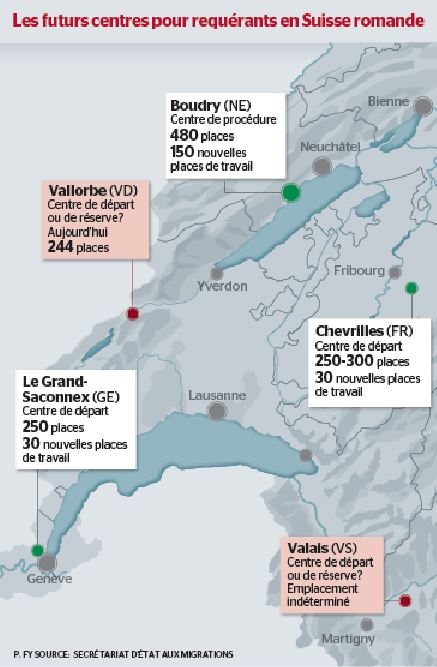 Sur les1280 places attribuées à notre région linguistique, 480 seront situées à Boudry (NE), dans l’ancien hôpital psychiatrique de Perreux. Il s’agira du seul centre de procédure romand. Les autorités neuchâteloises se réjouissent, en quelque sorte, d’avoir décroché le jackpot. Elles parlent en effet d’«impacts positifs pour le canton et la commune». Car150 emplois seront créés. Et de l’argent fédéral est garanti sur le long terme ainsi que diverses compensations.