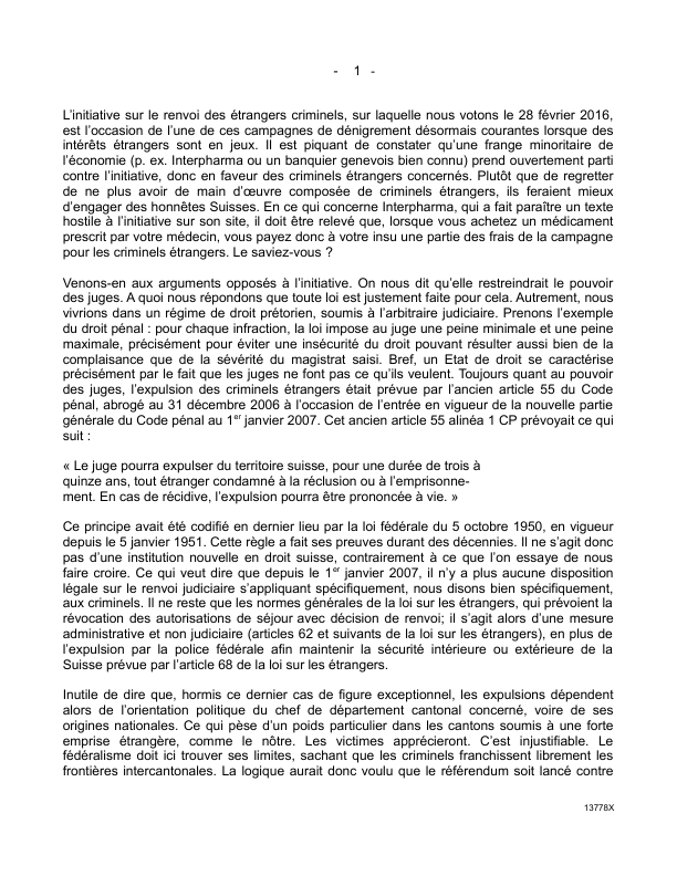 Les criminels de nationalité étrangère et/ou binationaux, auteurs de délits criminels au sens du code pénal suisse, purgent leur peine en Suisse et ensuite sont expulsés manu militari. Si cela est impossible, ils retournent en cellule en Suisse pour au moins 15 ans. quant aux Suisses, code pénal. C’est simple, correct. Que d’histoires !