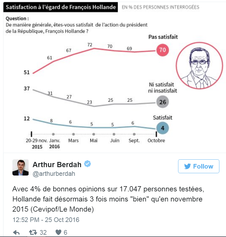 Ce qui est inquiétant en regardant ces chiffres, c’est qu’il y a encore 4% d’idiots qui sont satisfaits de François Hollande !
