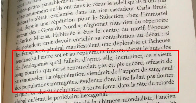 A propos d’une discussion évoquant le film « bienvenue chez les Ch’tis », Carla Bruni lâche, selon Patrick Buisson : « heureusement qu’ils ont dans le coeur le soleil qu’ils n’ont pas dehors ». Ce dernier raconte ensuite : « habituée à être le centre du motif, l’épouse du président crut devoir enrichir sa contribution au débat : si les Français en général manifestaient une déplorable et fâcheuse tendance à l’entre-soi et au repliement frileux, c’était le huis clos de l’endogamie qu’il fallait, d’après elle, incriminer, ce « vieux sang pourri » qui ne se renouvelait pas et, pis encore, refusait de se renouveler. La régénération viendrait de l’apport de sang neuf des populations immigrées, évidence dont il ne fallait pas douter et que l’on devait acclimater, à toute force, dans la tête du retardé global qu’était le prolétaire hexagonal. »