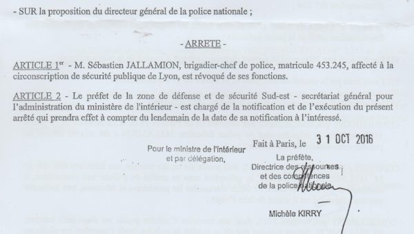En effet, alors que je ne cesse de dénoncer, notamment à travers ma situation, les graves dysfonctionnements au sein de la police nationale qui sont le fait d’une hiérarchie servile et politisée qui au lieu de défendre ses troupes n’hésite pas à faire des exemples, usant parfois de méthodes explicitement illégales, au point que les policiers travaillent aujourd’hui avec une épée de Damoclès au dessus de la tête, dont la fragilité du fil les mène parfois à ne pas se défendre comme ils le devraient, de peur des sanctions dont ils pourraient faire l’objet, me voici révoqué sur proposition de Jean-Marc Falcone, Directeur Général de la Police Nationale.