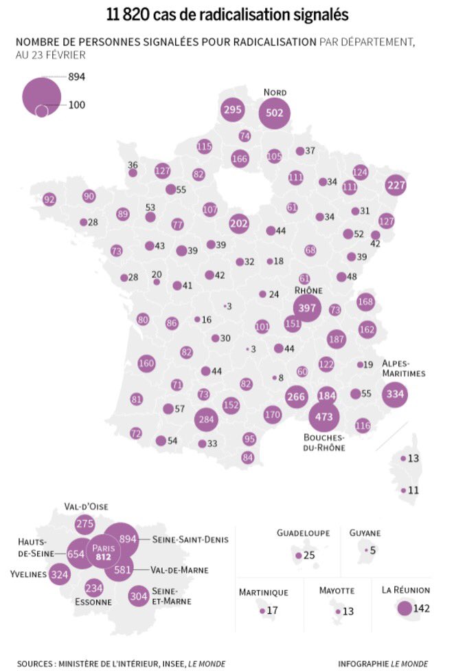 Trois ans après la création du numéro vert, cette base de données offre un tableau synthétique de la radicalisation à travers le pays. Les départements les plus touchés sont, sans surprise, les plus peuplés, et regroupés en Ile-de-France : derrière la Seine-Saint-Denis (894 signalements), on trouve Paris, les Hauts-de-Seine et le Val-de-Marne. Suivent les départements du Nord, des Bouches-du-Rhône, du Rhône et des Alpes-Maritimes. (Le Monde)