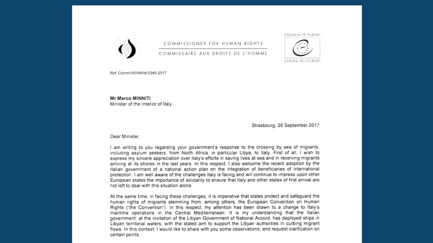 « Cette obligation est établie sans ambiguïté par la jurisprudence de la Cour européenne des droits de l’homme, écrit le Commissaire, et je pense que ceci concerne les opérations italiennes dans les eaux territoriales libyennes. À la lumière de rapports crédibles, établis récemment, concernant la situation en matière de droits de l’homme des migrants en Libye, remettre des personnes aux autorités libyennes – ou à d’autres groupes en Libye – exposerait les intéressés au risque réel de subir des tortures ou des peines ou traitements inhumains ou dégradants.