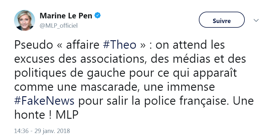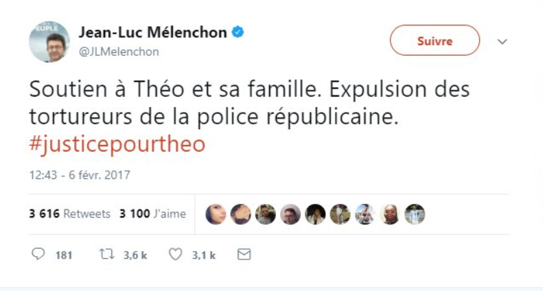 Il y a bientôt 1 an, Hollande rendait visite à théo à l’hôpital (mais pas aux policiers brûlés par la canaille). Mélenchon se fendait d’un “Soutien à Théo et sa famille. Expulsion des tortureurs de la police républicaine.” …