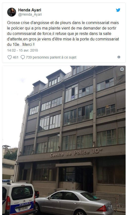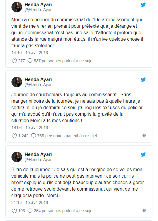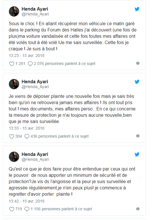 Le 15 avril, Henda Ayari affirme sur le réseau social avoir retrouvé sa voiture dégradée dans le parking des Halles, à Paris. Ses affaires personnelles et ses documents auraient été volés. Elle s'indigne que son dépôt de plainte et d’un complément d’information ait duré plusieurs heures.