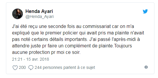 Elle implore le droit à une protection policière, mais rien ne lui aurait été accordé selon elle.