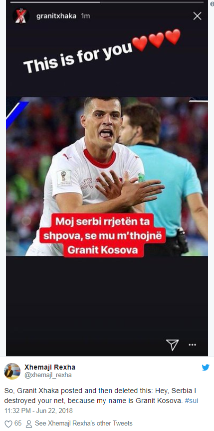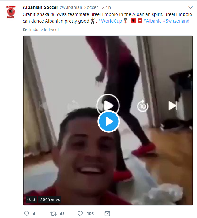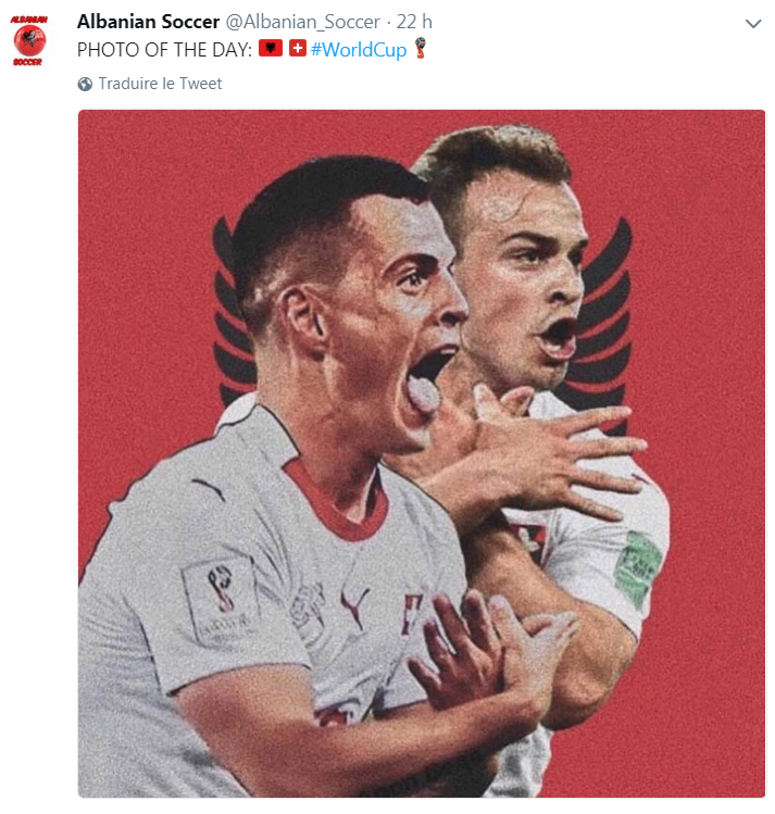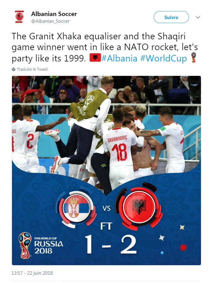 L'égalisation de Granit Xhaka et le but décisif de Shaqiri sont survenus comme des roquettes de l'Otan : c'est la fête comme en 1999 (indépendance du Kosovo par l'intermédiaire des armées de l'Otan). A noter le drapeau albanais en bas du tweet au lieu du drapeau suisse.