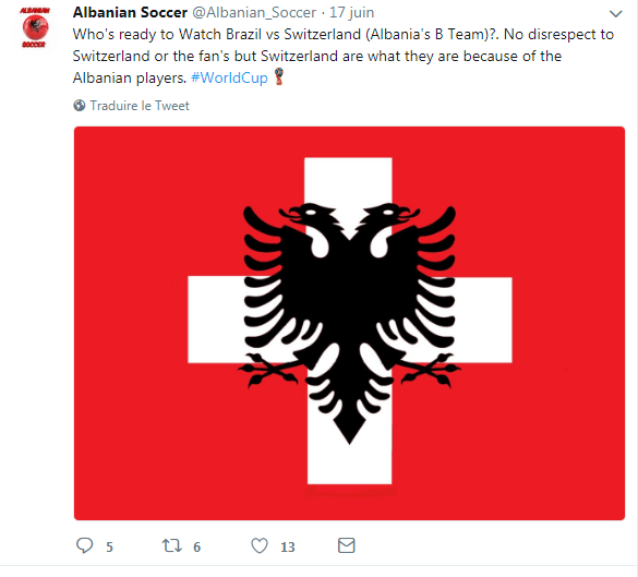 "Qui est prêt à regarder le Brésil contre la Suisse (L'équipe B de l'Albanie)? Pas d'irrespect envers la Suisse ou ses fans mais la Suisse est ce qu'elle est grâce aux joueurs albanais."