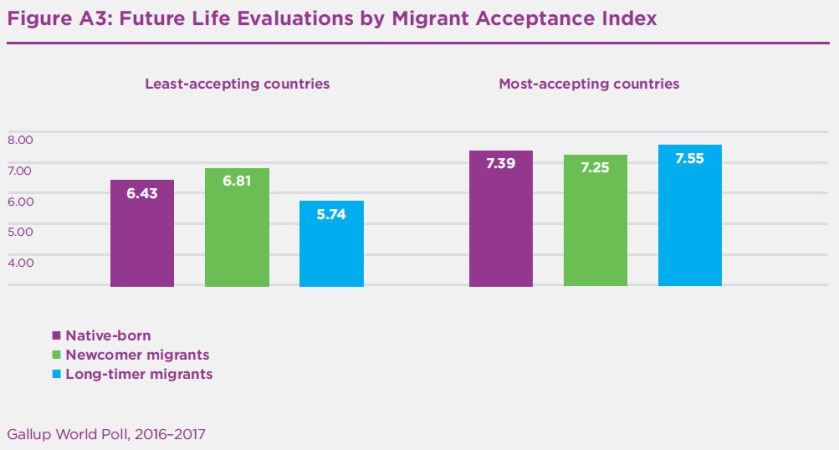 Qui plus est, les migrants en général (on n’a pas ici de chiffres séparés par provenance, ni par religion, hélas) signalent très systématiquement un taux de satisfaction supérieur (même à celui des gens nés dans le pays) peu après leur arrivée. Cinq ans plus tard, leur niveau de satisfaction baisse très légèrement dans les pays accueillants (probablement car ils commencent à se comparer aux membres les mieux lotis de la population autochtone) et fortement dans les pays peu accueillants: