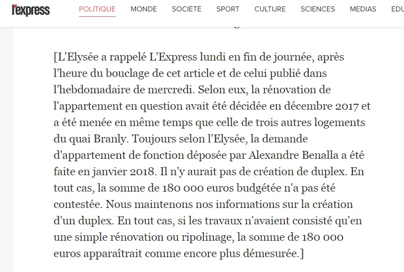 Mise à jour du 27 juillet :L'Elysée dément des travaux pour Benalla dans un logement public à Paris, information soutenue par l'Express.