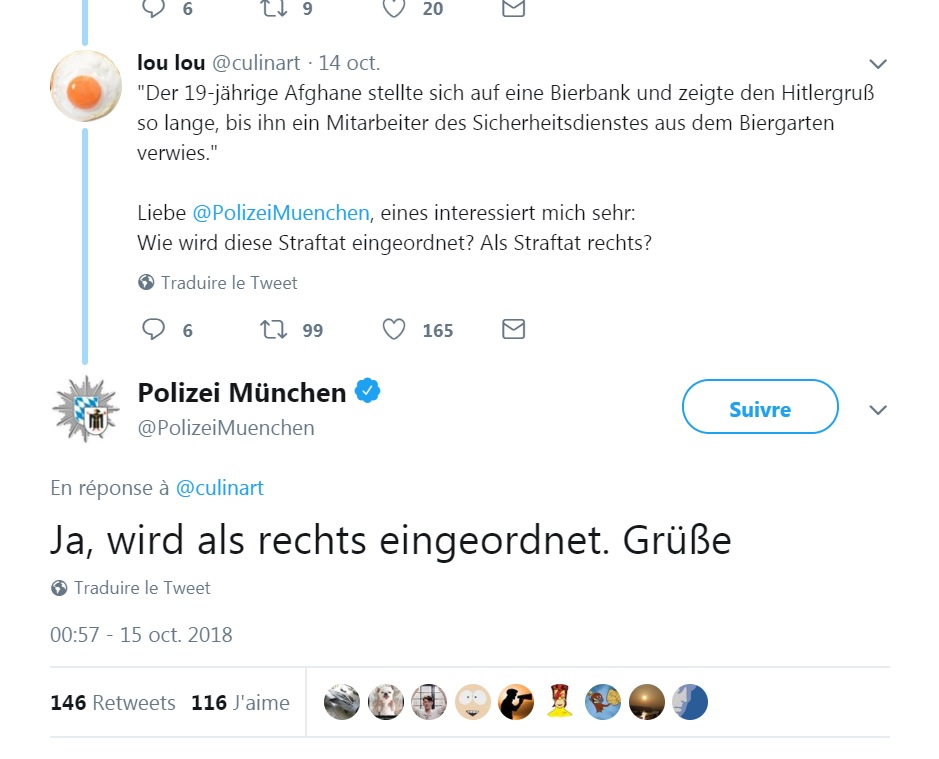 Lorsque la police de Munich a diffusé la nouvelle sur Twitter, un utilisateur a demandé si le crime était désormais classé comme un crime d'extrême-droite, la réponse de la police de Munich : "Oui, ce sera classé ainsi. Salutations"