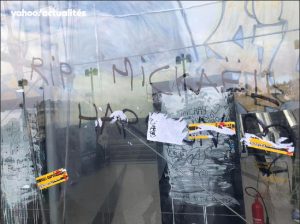Les journalistes qui se sont rendus sur les lieux ont photographié plusieurs inscriptions visant la police, dont «Couteau en céramique» et «RIP Mickaël Harpon» qui font référence à l’auteur de la tuerie et à l’arme qu’il a utilisée.