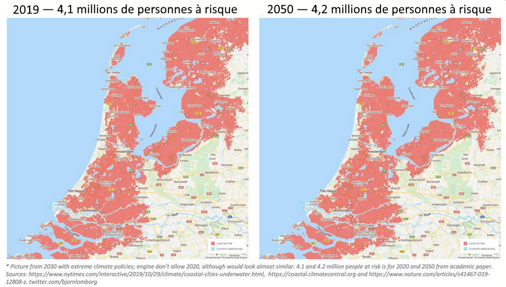 C’est ainsi que le diffuseur public belge, la RTBF, a repris la dépêche catastrophiste de l’AFP en y ajoutant 40 millions de personnes menacées, pour ce diffuseur subventionné il y aurait en effet 340 millions de personnes menacées... La RTBF ajoutait une carte des côtes belges menacées oubliant — comme le New York Times — de mentionner qu’il s’agirait de zones inondables une ou deux fois par an (en l’absence de digues) et que la Belgique a déjà de ces polders, ces zones habituées situées sous le niveau de la mer aujourd’hui, en 2019.