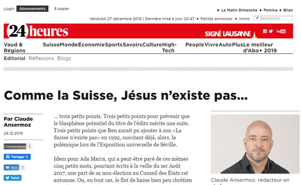 Pendant que Le Figaro rend hommage aux chrétiens persécutés durant la période des fêtes, Claude Ansermoz, rédacteur en chef du 24 Heures, n'a rien trouvé de mieux que d'humilier les chrétiens tout en faisant l'apologie de la socialiste Ada Marra. Et cela, le jour même de Noël.