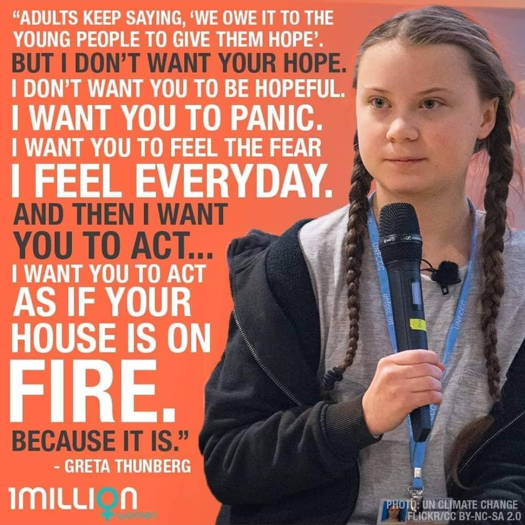 I WANT YOU TO PANIC « Je veux que vous paniquiez », dit Greta aux hommes politiques et aux multimillardaires du Forum économique mondial et à travers eux, aux électeurs des pays occidentaux. « Je veux que vous ressentiez la peur que je ressens chaque jour et puis je veux que vous agissiez. Je veux que vous agissiez comme si votre maison était en feu parce que c’est le cas. »