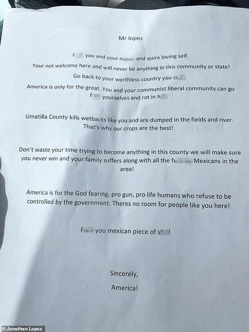 Selon le chef de la police Jason Edmiston, l'enquête a montré que Jonathan Lopez [NDLR : politicien démocrate, c'est-à-dire de gauche] a écrit la lettre lui-même et qu'il a fait de fausses déclarations à la police ainsi que sur les médias sociaux. L'affaire sera renvoyée cette semaine au bureau du procureur du comté d'Umatilla pour avoir lancé un faux signalement - un délit de classe A dans l'Oregon.