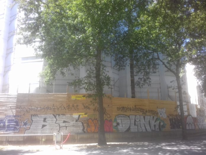 Au chevet de la cathédrale, la palissade du chantier au chevet est un livre ouvert : publicité pour la drogue (bon shit, avec une tête de fumeur qui prend visiblement bien du plaisir), inscriptions gauchistes (ACAB) ou zadistes (Ronces, du nom d’un jardin autogéré et squatté rue de la Papotière, au Vieux-Doulon, géré par des zadistes qui s’opposent à une opération d’urbanisme) et même satanistes (Lucifer).
