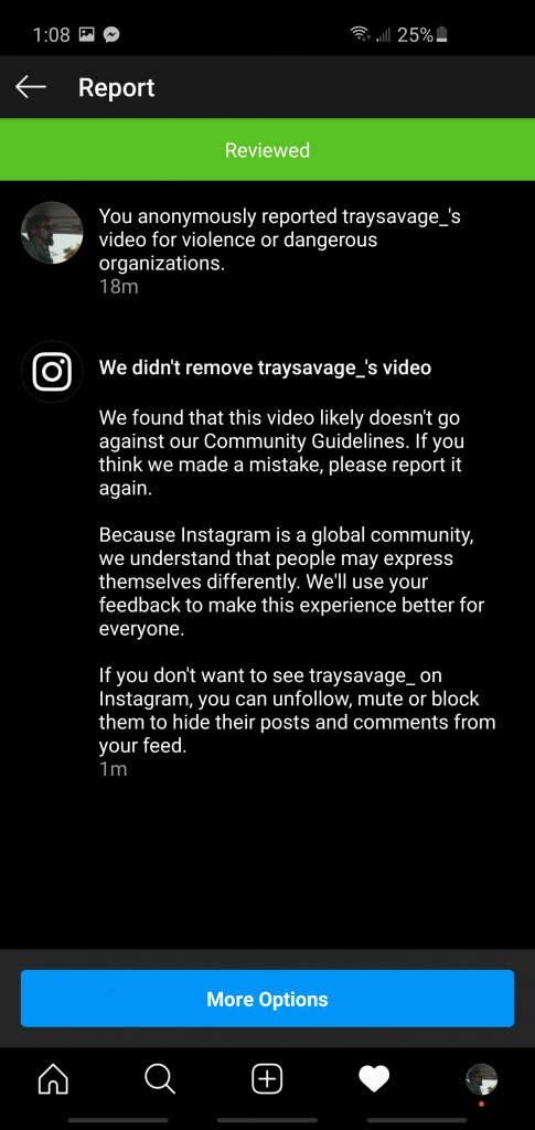 L'utilisateur qui a signalé la vidéo est indigné. Instagram lui a répondu que la vidéo ne viole probablement pas les normes communautaires de la plateforme.