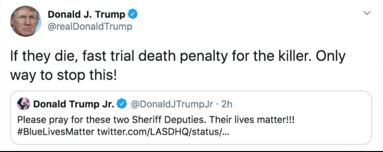 Donald Trump a également condamné la fusillade de ces adjoints dans une déclaration enflammée sur Twitter dimanche.