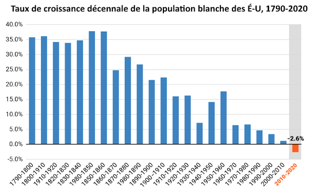 Pourtant, ce qui frappe le plus c’est le déclin en termes absolus de la population blanche, le premier déclin depuis le tout premier recensement en 1790. Pendant une grande partie de l’histoire des Étas-Unis, la croissance de la population blanche a reflété le taux de croissance national, y compris un ralentissement substantiel pendant la Grande Dépression. Pourtant, depuis les années 1970, la croissance de la population blanche a continuellement baissé, tombant à seulement 1,2 % de 2000 à 2010 pour aboutir de 2010 à 2020 à une perte de -2,6 % du nombre de blancs (ou plus de 5 millions de personnes).