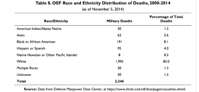 Selon le Congressional Research Service en 2014, les Blancs représentaient 85,0% des décès de militaires américains en Afghanistan: